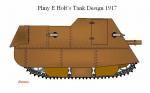 In the US patents files I found a patent applied for in 1917 by Pliny E Holt. Its actualy titled as an armoured tractor but is in fact a tank or assault gun. I enclose an impression of what it might have looked like if built. The patent drawings although sectional have many missing details such as where the exhaust was and where the driver sat. It was clearly not inteded to be just a box on an existing tractor as the engine position (in the middle) rules this out. It would be interesting to know if one of the Holt factories ever built a mock up (or even a real prototype).
