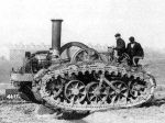 "The 1896 machine from Hornsby was redesigned in 1905 and equipped with full tracks. The engine was the same single cylinder used in the wheeled unit."