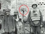 The more I look at this, the less I understand it. What on earth is going on? I can't decide about the cuffs. Where did all those helmets with the nosepiece come from? Has the man on the right got a Tanker's mask round his neck or is it a French gasmask? Maybe they're not even Germans - perhaps Allied troops going through captured German equipment and larking about for the camera. I think the bloke on the left must have found a Pickelhaube spike from somewhere and inserted it.