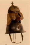 It seems that some attempts were made to improve the M16 Stahlhelm, resulting in the versions shown here. Circled is helmet with noseguard, Stirnpanzer, and ear cutouts. Model with noseguard on right. On left, Stahlhelm with Pickelhaube cover. The man on the left must be mucking about. Or they might all be. Are they wearing pyjamas under their tunics?