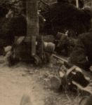 Comparing the man on the right with the rifle, and doing some scaling: The 1886 rifle is 130,7cm in real life, the man's head 18cm, makes the man 1,40, I guess.. He is not sitting, if so that would make a giant out of him compared to his comrade.