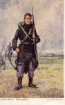 The folding bucket that can be seen very clearly on this Chasseur was introduced in 1888, replacing the bidon de campement, a large canteen of maybe 10 litres. PL says that the blanket/tent was often carried under the flap of the pack (as in the second pic), and a brown, grey, or other drab colour substituted for the highly visible white regulation issue.