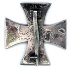 bei dem Abzeichen handelt es sich um das Eiserne Kreuz erster Klasse, das für besondere Tapferkeit verliehen wurde. Die Gravur erfolgte nachträglich, denn das EK I mit einer Gravur zu versehen war war nicht üblich. Ich selbst habe dieses noch nie gesehen. Somit hat meiner Meinung nach die verleihende Einheit dieses in eigener Regie veranlasst, um den Soldaten besonders zu Ehren.