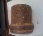 10cm high, 9cm 'base' diameter, 11cm 'top' diameter. there's what looks like a firing pin, in brass, on the 'base', about 1cm diameter. there's a thread on the 'top', before the lip/widest part. there's evenly spaced small holes all around the side. there's a kind of brass cylinder embedded/inserted in the top. it's heavy - not empty