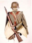 Acc to various references, the belt was the location of most of the infantryman's accoutrements (entrenching tool, bayonet, ammo pouches, breadbag, and canteen) and was partially supported by hooks sewn into the Waffenrock (as was the practice in the British and Belgian Infantry). The M1895 pack had straps that could be attached to the belt at the front to support the weight of the pouches but was otherwise completely separate. I've also seen photos of German troops with a strap that ran round the back of the neck (like the Italian kit) to support the pouches, but I can't find any mention of Y-straps. AFAIK only the French and Serbs had them, largely because of their dorsal ammunition pouch. There doesn't seem to be any explanation for the crossed straps on the standing rifleman.