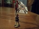 In the midst of all these shiny intruments, is the Standard bearer. He is the other focal point of the band. His standard is typical of Prussian line standards of the day, with jubeliee or kings colors borne in the ribbons with the flag.