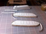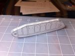 Model views with the tanks and one set with the tank supports only. The tanks are segmented into six equal-length segments, presumably water-tight compartments. a single compartment fits nicely at the front. The logical places to support the tanks would be at the bulkheads and end plates, so seven supports per tank. some of these would fall on the doors - not a good place to do this. Other than that they seem pretty well located. The configuration of the supports themselves are not evident from the video or the single still shot. I plan to have a "strap" around the tank at the support, which could be the rib that appears in the photos. Any ideas?