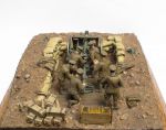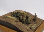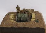 "Well the paint scheme does vary somewhat according to the calibre of the shell, but generally HE shell is buff (dirty-white) overall. The 18 pdr then has a half-inch ring painted around the body about two inches down from the fuze. This may be a hatched ring depending on whether the ammunition is suitable for desert and tropical conditions. Below this about the centre is a green band about 1.5 inches deep, denoting amatol filled, with figures denoting the % of ammonium nitrate and trotyl stencilled beneath: typically 80/20. There is additional stencilling denoting the presence of a gaine fitted inside the shell, or not and the place and date of filling. 4.5 inch howitzer shell is similar but the stencilling includes the calibre and mark number. There were variations in the overall paint such as green for smoke shell (although this may be post-War) and grey for chemical. Star shell was usually black and incendiary red and buff. Common shell was black with a white tip and a red band. There were many variations within these schemes. The paint was not very durable under the handling it received in the field and is not often discernable in contemporary photos."