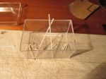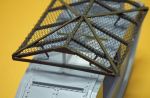 Best way of getting the legs right: drill hole through beam (at right angles to beam) cut 10mm rod and pass through each of the 4 holes, adjust each rod until the grenade cover is level along and across the tank roof. When happy that all is square and correctly spaced MEK the rods and, when dry, cut the excess from the outside, smooth, paint and apply netting. Once that is done paint and fix the diagonal bracing strips (thinnest section plasticard) again using PVA as it sticks well enough to the painted plastic.