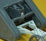The shield is symmetrical and, to my eyes, the photo of a shield on a damaged tank suggests otherwise. It appears to me that the side of the shield adjacent to the door has less of an angle than that side which is attached right next to the ventilation louvre. I have thus offset the shield slightly, to the left. It further appears that the mounting support for the upper cross member of the tail springs is also offset with regard to the shield but central in respect of that cross member. I have replicated this feature.