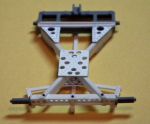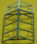First thing this morning I carefully drilled 6 holes in the appropriate V cross members. Careful measurement indicated that the holes should be 5.5mm from the outer edges. I used a .3 mm drill and the supports are made with .25mm carbon fibre rod, the slightly oversize hole allows sufficient lee way to position the rods before using a drop of liquid cement to secure. I used a spacer under the front cross member ( above the cab roof) and a piece of H section styrene strip to support the rear. When dry I will create the 'wings' over the gun sponsons, paint and attach my netting.
