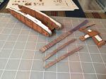 The model is coming along, albeit a tad slowly. The photos show the first build in progress. The pieces on the cutting board are for the rear superstructure. I have two transverse formers at roughly the third points, but nothing longitudinal yet. I hope to finish the superstructure shell tomorrow. So far all seems to be going pretty well. I have applied the hatches to the left cab, but not on the right one, and none of the other details.