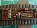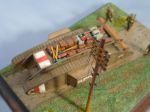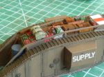 Here it is with crates and canvas rolls added, the crates were dry-brushed with burn umber oil paint over the pale yellow resin. To vary the colour more or less oil paint was left on the brush.