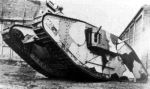 What is the history behind this MkIV Female tank? It has unusual striking camouflage. It does not have unditiching rails or allied identification white red white markings on the front horns. This would date the photograph to pre Cambrai or post war. Can anyone identify the tank? Are those search lights above the tank fitted to the top of the cabin or on the building?