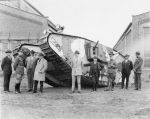 caption reads "Murray Baker, third from left, along with Gen. John J. Pershing stand outside the East Peoria Holt Plant next to a British tank in 1925. The Holt tractor served as the inspiration for the development of the British tank in World War I."