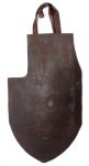 This is the Daigre pattern personal armor shield made of 8mm thick ballistic steel, 58.5cm long x 34.5cm wide, convex profile, with pointed base, large rifle firing notch cut in the right corner, and a considerably smaller mobility cut in the left shoulder. Interior has three stout metal attachment brackets, with a black leather strap attached to the top two. Bashford Dean reported that several models of this particular shield were made in France early in the war, invented by "M. Daigre."