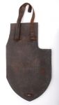 This is the Daigre pattern personal armor shield made of 8mm thick ballistic steel, 58.5cm long x 34.5cm wide, convex profile, with pointed base, large rifle firing notch cut in the right corner, and a considerably smaller mobility cut in the left shoulder. Interior has three stout metal attachment brackets, with a black leather strap attached to the top two. Bashford Dean reported that several models of this particular shield were made in France early in the war, invented by "M. Daigre."