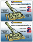 On 21st October, 1916, orders were given for trials of a 6-inch mortar, the design of which had been developed in France by Lt.-Col. H. Newton. Towards the end of January, 1917, it was arranged to produce 1,700 of these to replace the same number of 2-inch trench howitzers. Deliveries began in May, 1917. The Newton was deployed by the UK, Canada, New Zealand, Australia, the USA, and others.