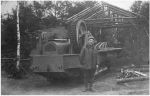 "Late in 1918 an experimental mount for the 155mm GPF gun was developed and one was built, by using a modified 10-ton Renault tractor with gear driven chain treads and a 110 hp airplane motor located in a housing on top of the platform. The mount was arranged to receive the top carriage, chassis, elevating and traversing mechanism of the wheel mount. In order to fire the gun it was shifted from its travelling position in the centre of the platform to the left-hand side of the same and pointed crosswise. Two large outriggers with spades were attached to the platform to stabilise the carriage and jacks were also provided to support the platform. This arrangement gave a field of fire of 60 degrees. The total weight of gun and mount was about 19 tons. The mount was considered as a makeshift and the tests indicated the necessity for many changes in its design, the most important of which were a longitudinal firing position with an opening in the platform for the recoil of the gun, provision for a 10-degree traverse of the gun and the location of the outriggers at the rear of the chassis. It was thought that with the modifications proposed the mount would be fairly satisfactory and the proposed changes were in progress at the end of the war."